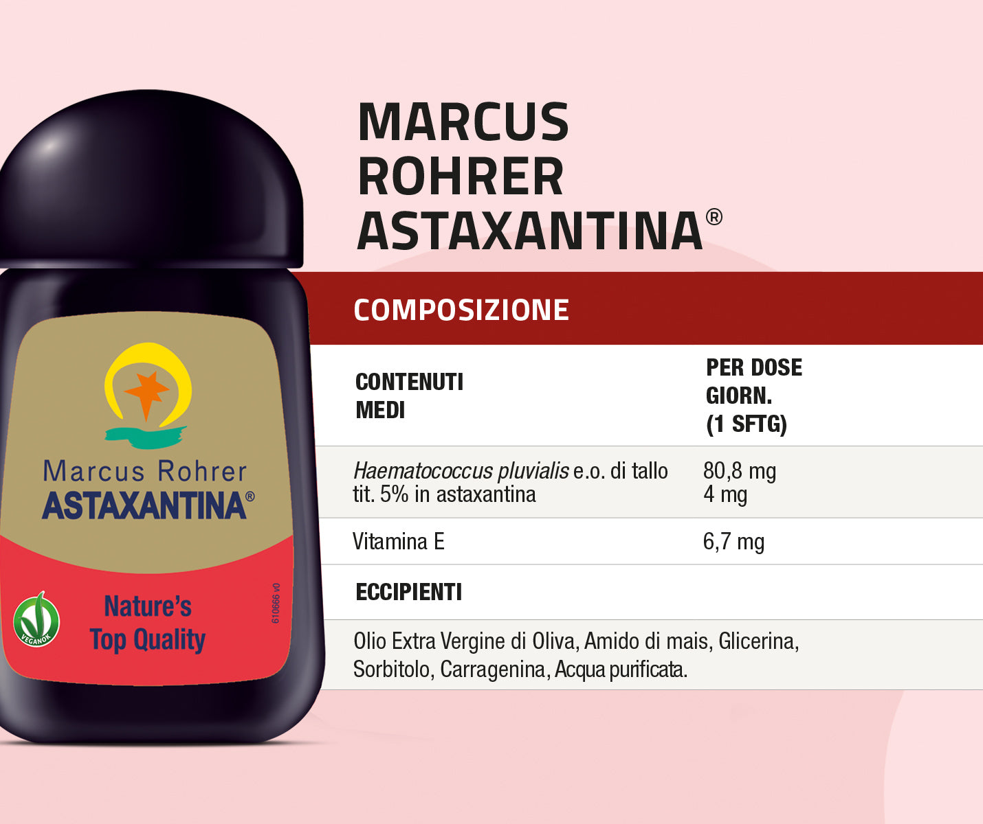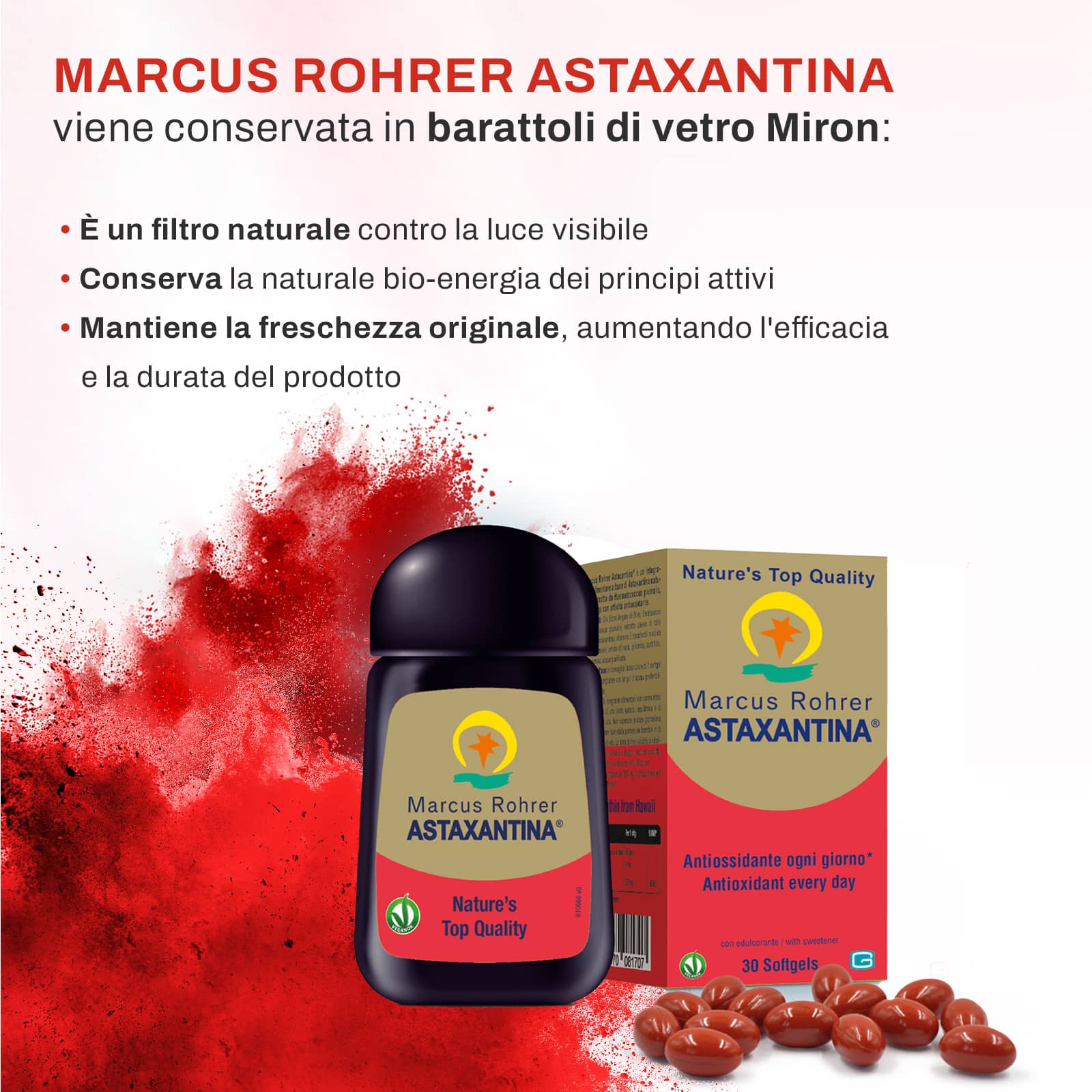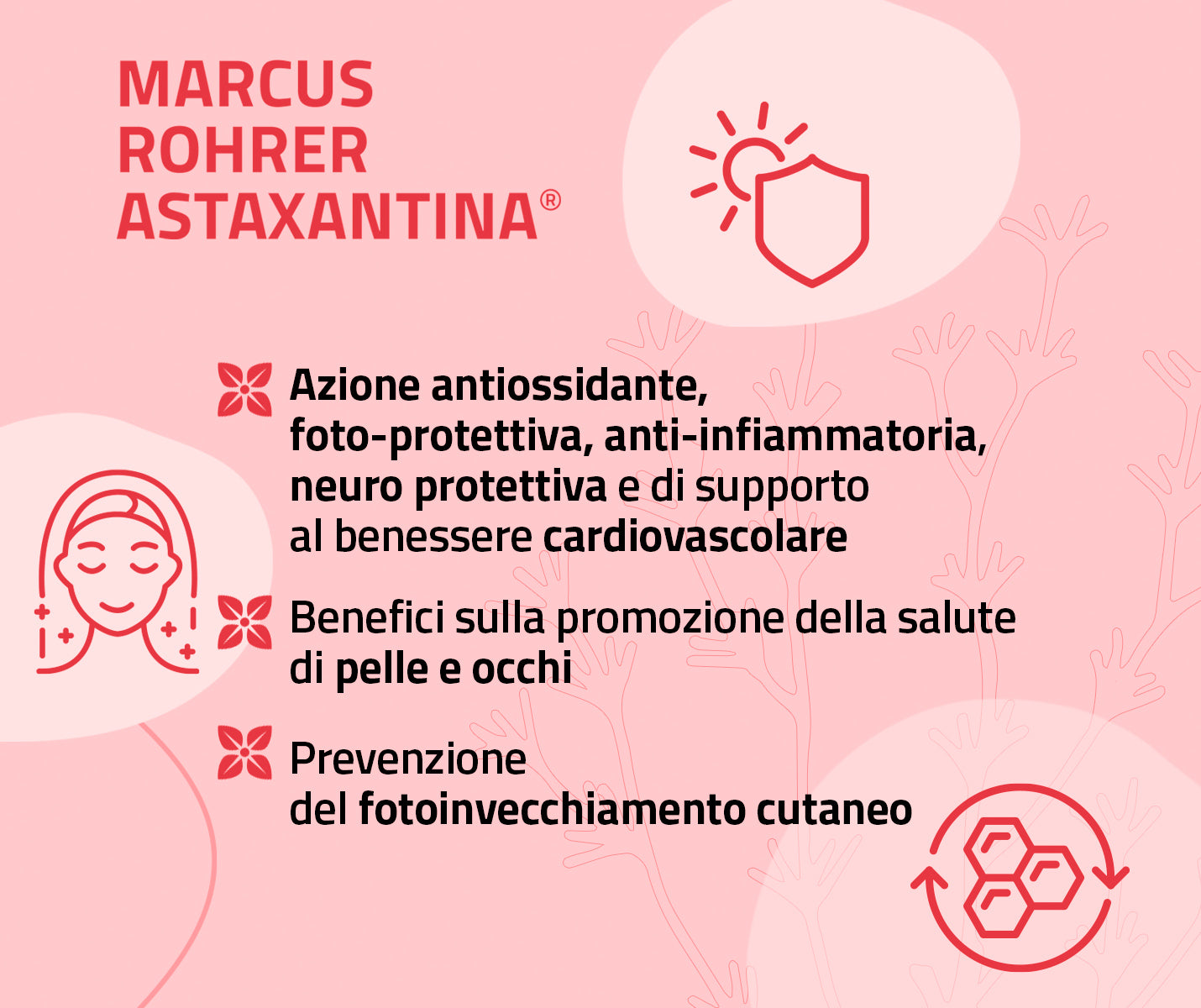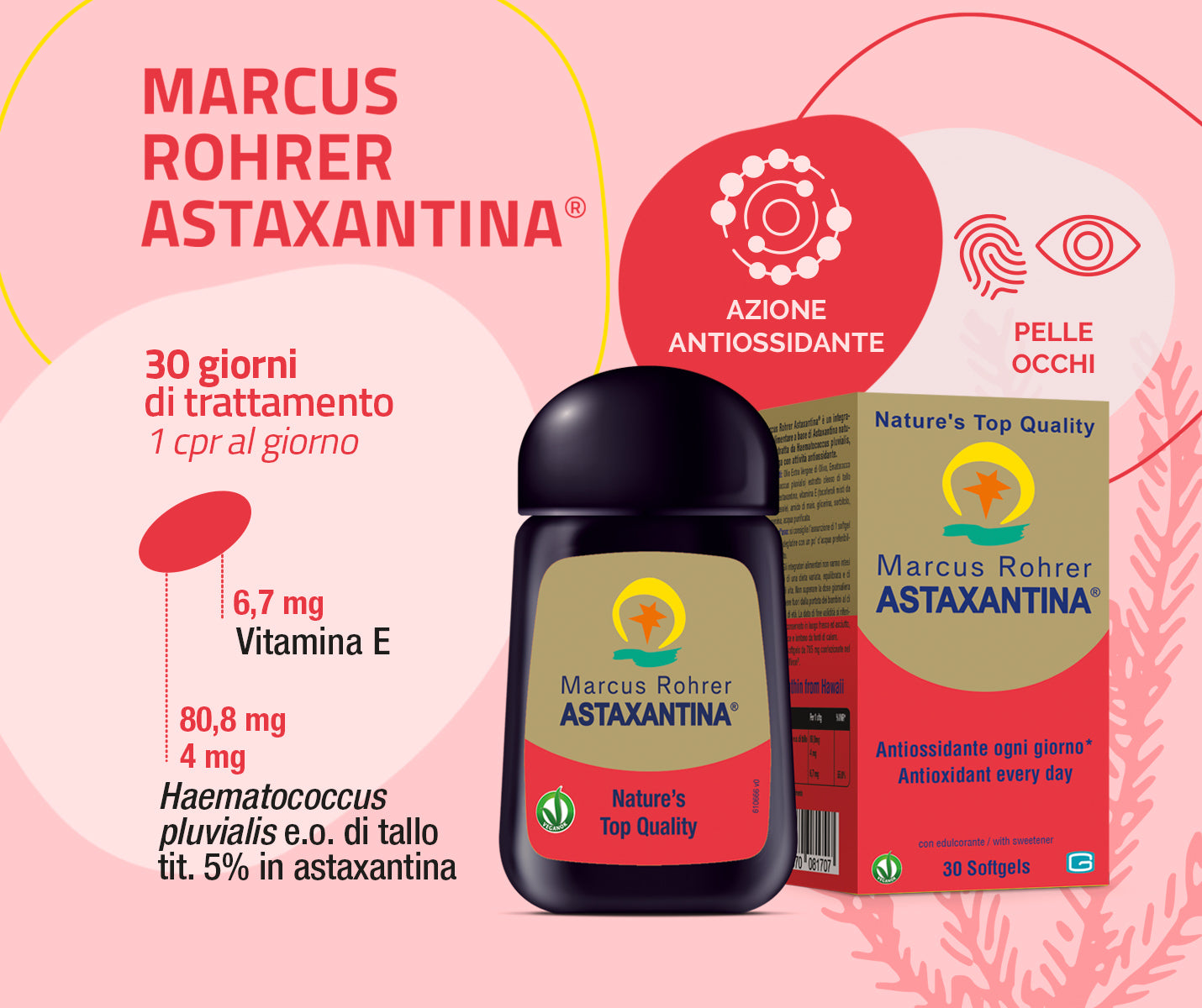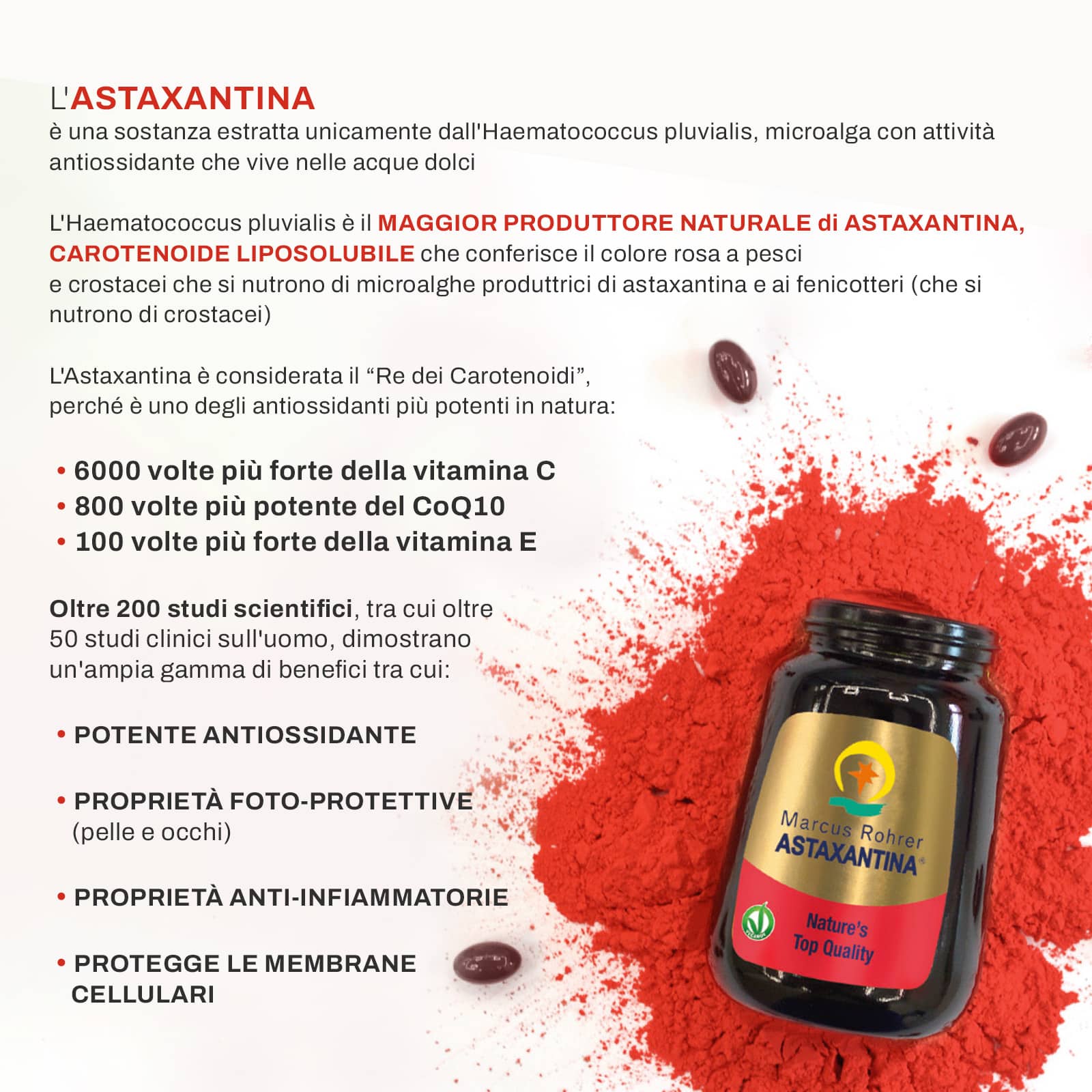 Marcus Rohrer Astaxantina è un integratore alimentare a base di astaxantina, un pigmento naturale presente in alcune specie di alghe e microorganismi.