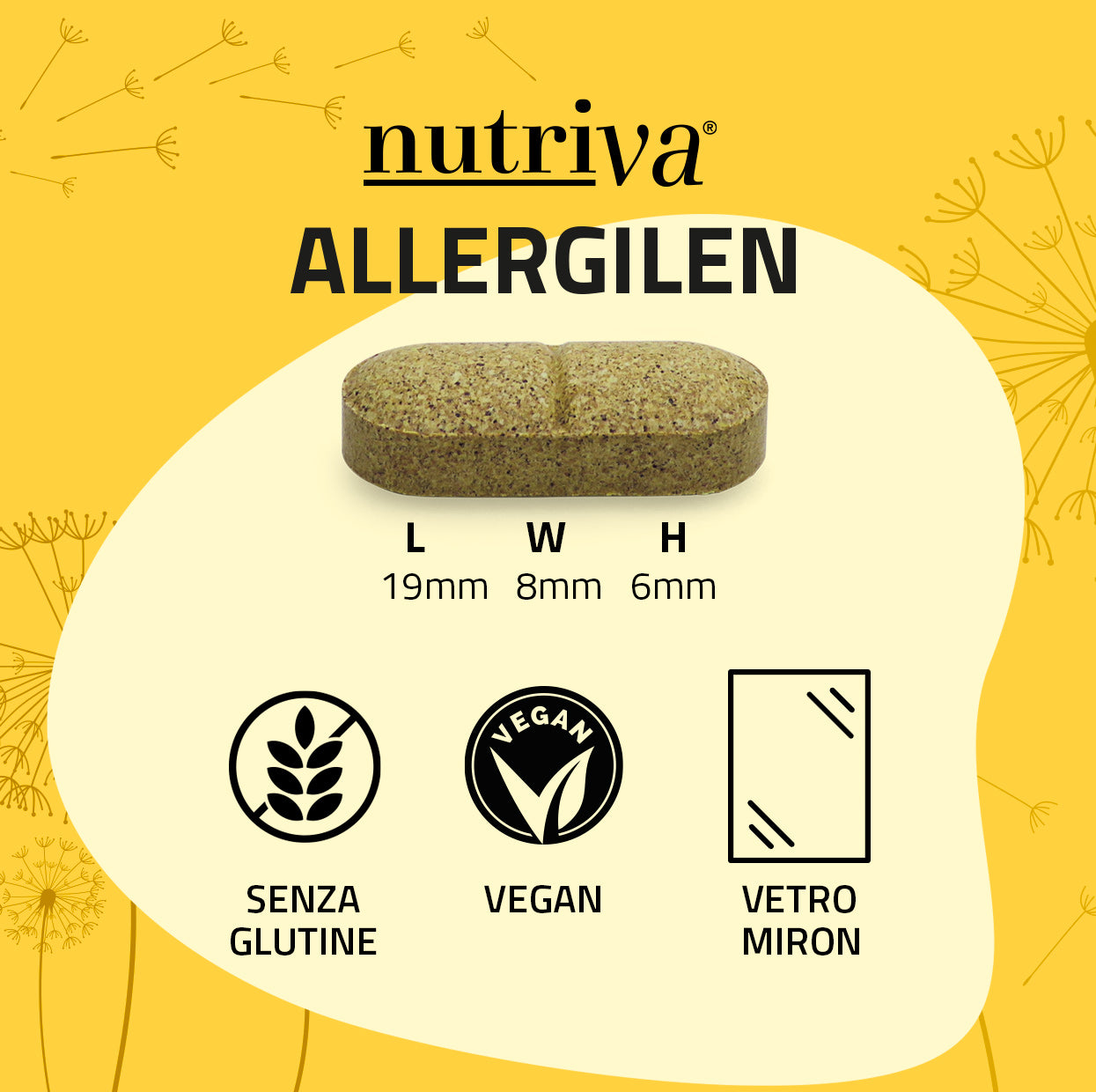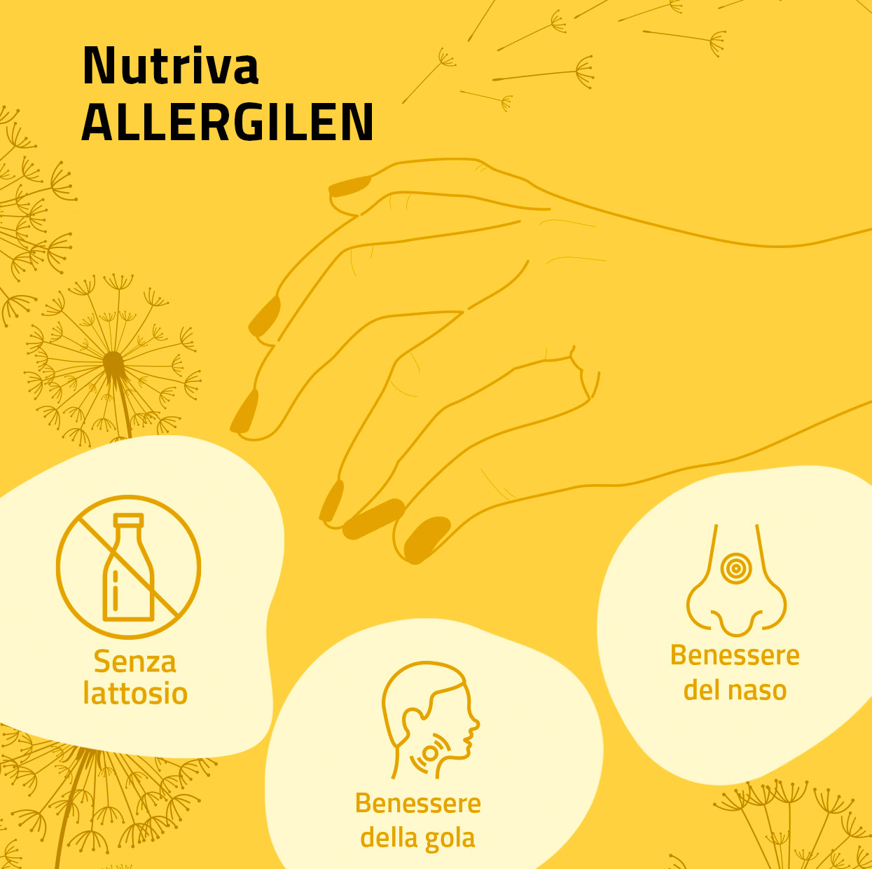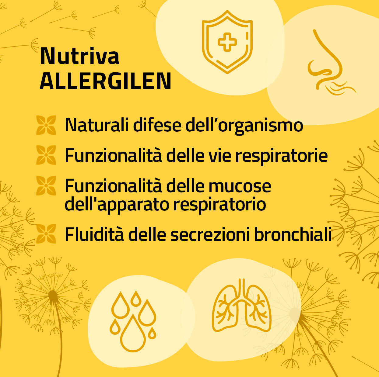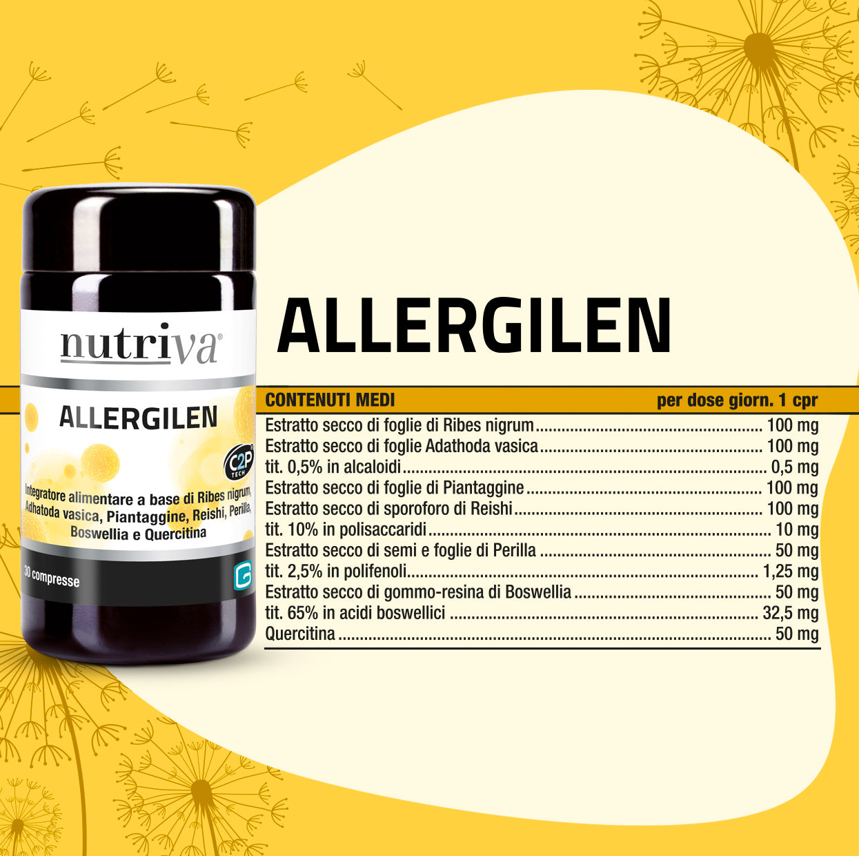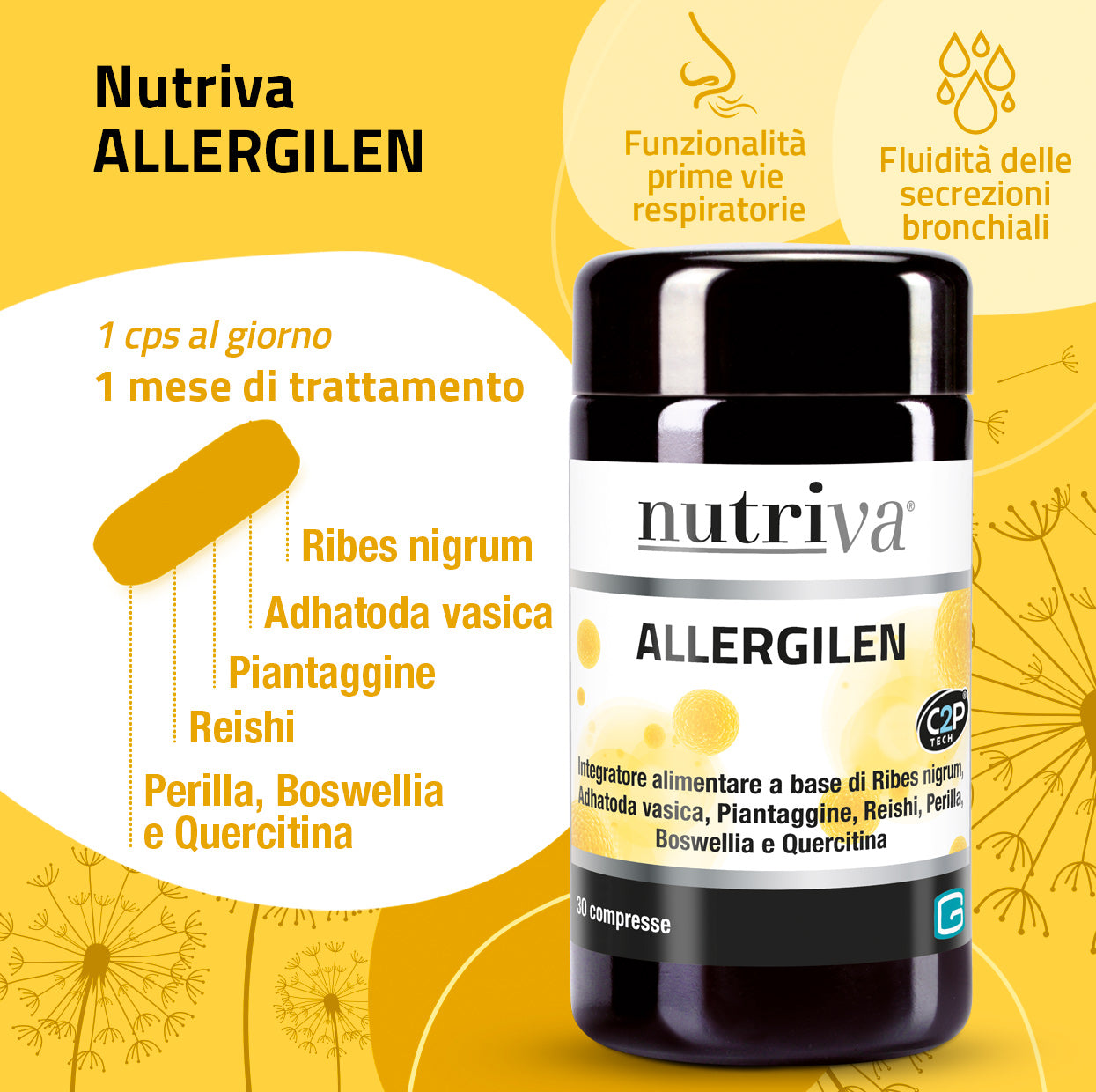 Nutriva Allergilen è un integratore alimentare a base di Ribes, Adathoda vasica, Piantaggine, Reishi, Perilla, Boswellia e Quercitina. L’Adhatoda contribuisce alla fluidità delle secrezioni bronchiali. La Piantaggine contribuisce alla funzionalità delle prime vie respiratorie e delle mucose dell’apparato respiratorio. Il Reishi e la Perilla contribuiscono alle naturali difese dell’organismo. Grazie alla sinergia dei suoi principi attivi, è particolarmente utile in caso di riniti e pollinosi di natura allergica.