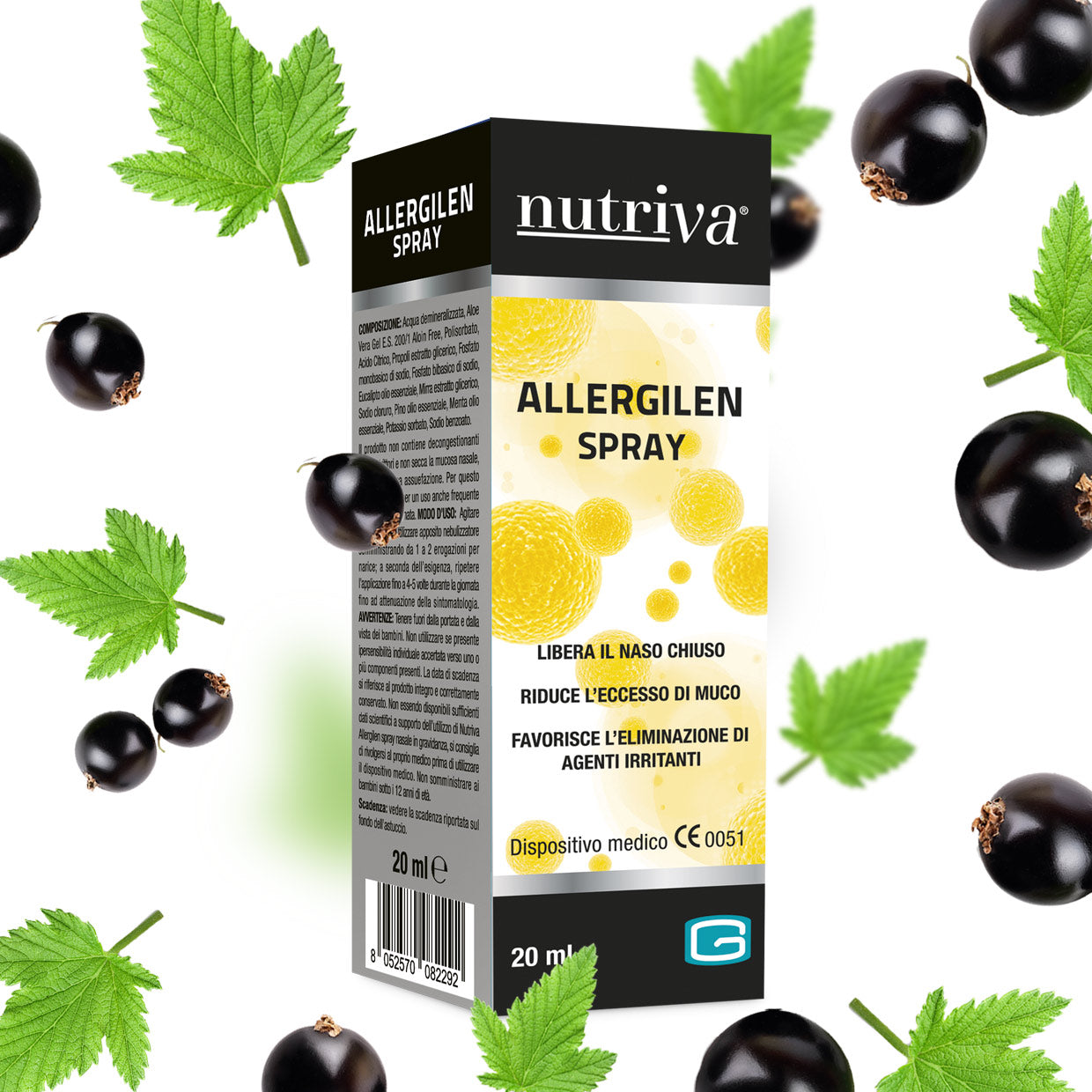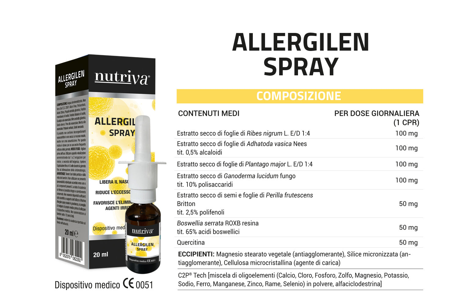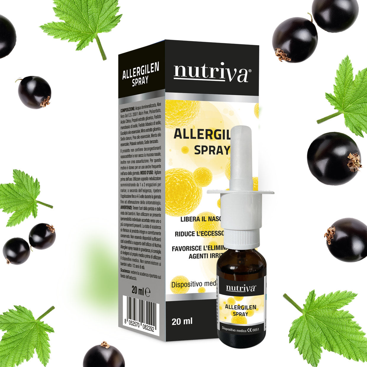 NUTRIVA ALLERGILEN Spray Nasale è un dispositivo medico a base di Aloe Vera, Propolis, Mirra, Eucalipto, Pino e Menta.Grazie alla sinergia dei suoi ingredienti, Nutriva Allergilen Spray Nasale favorisce la respirazione e libera le fosse nasali nei casi di malattie da raffreddamento, allergie, riniti e/o sinusiti. La formula di Nutriva Allergilen Spray Nasale esplica le seguenti attività: • riequilibra le secrezioni nasali e ne promuove l’igiene: la soluzione isotonica favorisce il lavaggio delle fosse nasali, inoltre gli estratti di Propoli, Aloe e Mirra contenuti, formano un micro-gel ad azione protettiva della mucosa nasale impedendo il contatto di agenti microbici e irritanti sulle mucose stesse. • libera le fosse nasali e dona una piacevole sensazione di fresco grazie alle proprietà balsamiche degli oli essenziali • protegge la mucosa dall’irritazione: le resine e le mucillaggini contenute in Nutriva Allergilen Spray Nasale creano una barriera che idrata le mucose proteggendole dalle irritazioni, ne riduce l’eccessiva secrezione e contrasta stati di secchezza dovuta ad agenti esterni quali fumo, aria e polline.