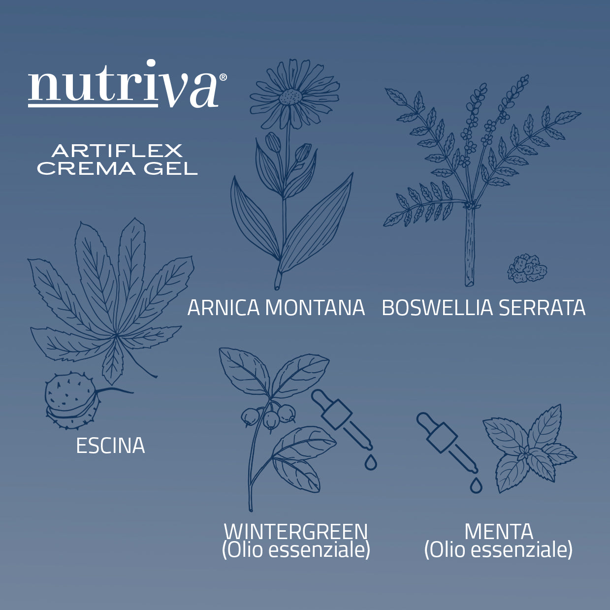 Nutriva Artiflex Crema Gel è un’emulsione a cristalli liquidi dalla particolare texture gelificata con oli vegetali a rapido ed elevato assorbimento per potenziare l’azione dei suoi attivi funzionali. La formulazione è ricca di fitocomplessi vegetali di Boswellia e Arnica, altamente concentrati grazie all’estrazione ottenuta attraverso tecnologia di bioliquefazione molecolare e anidride carbonica in condizioni supercritiche. Il prodotto è inoltre arricchito dalla presenza di Escina, olio essenziale di Menta Piperita e olio essenziale Wintergreen che esplicano un’azione rinfrescante e lenitiva. Emulsione ideale per effettuare un massaggio volto a donare sollievo a muscoli e articolazioni.