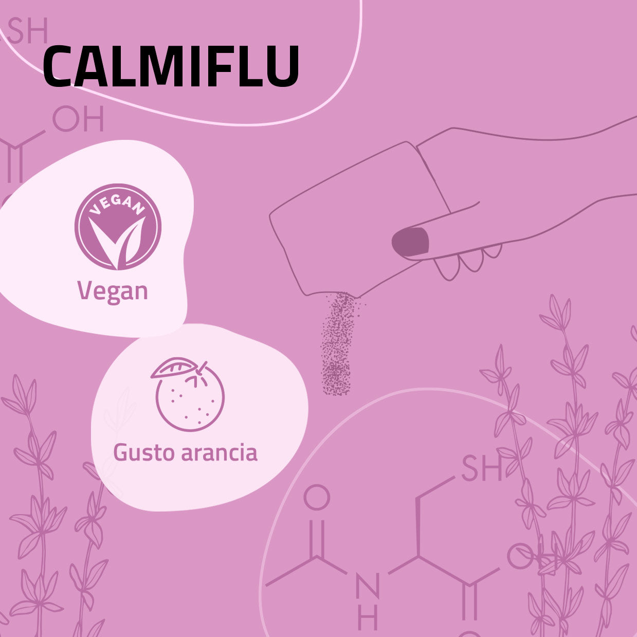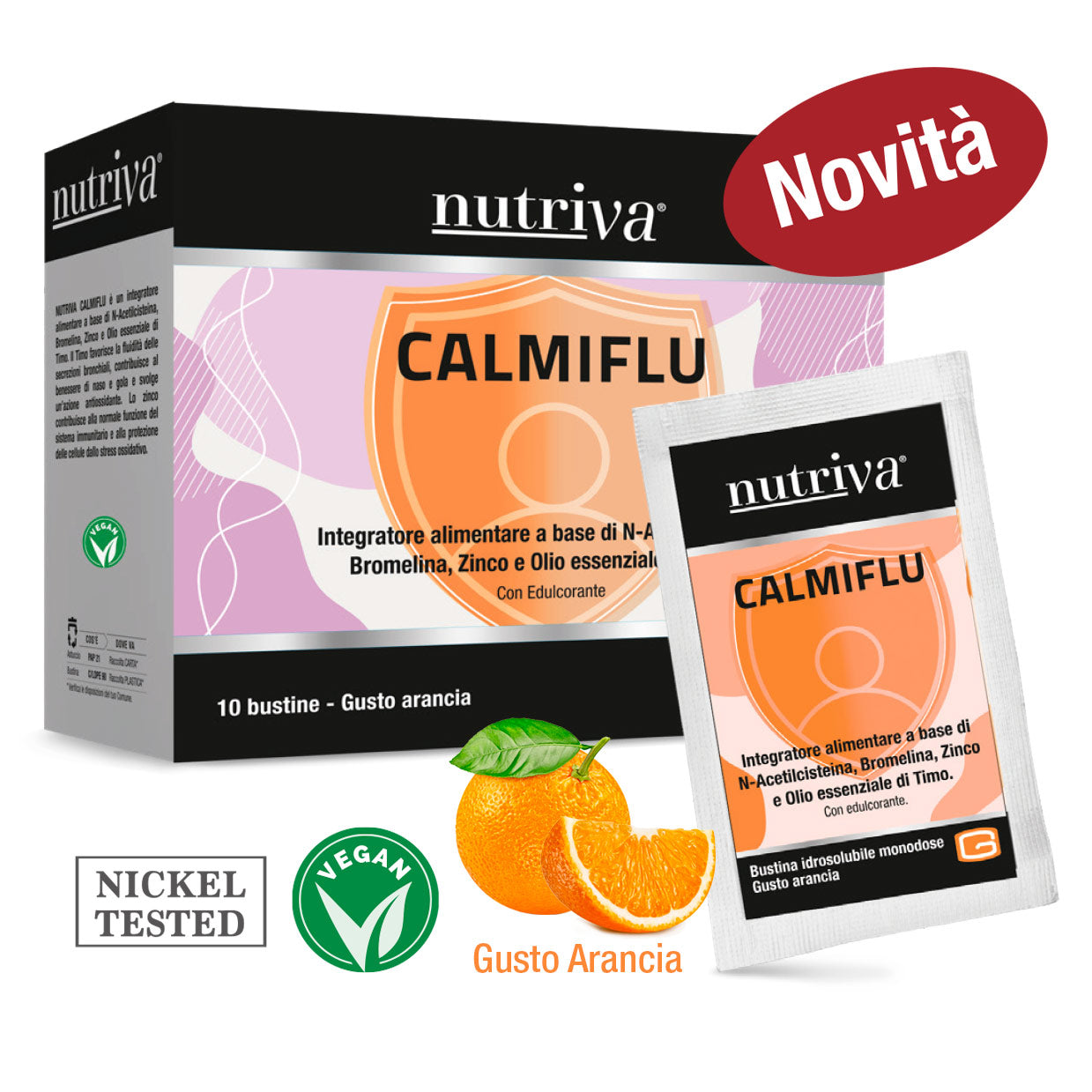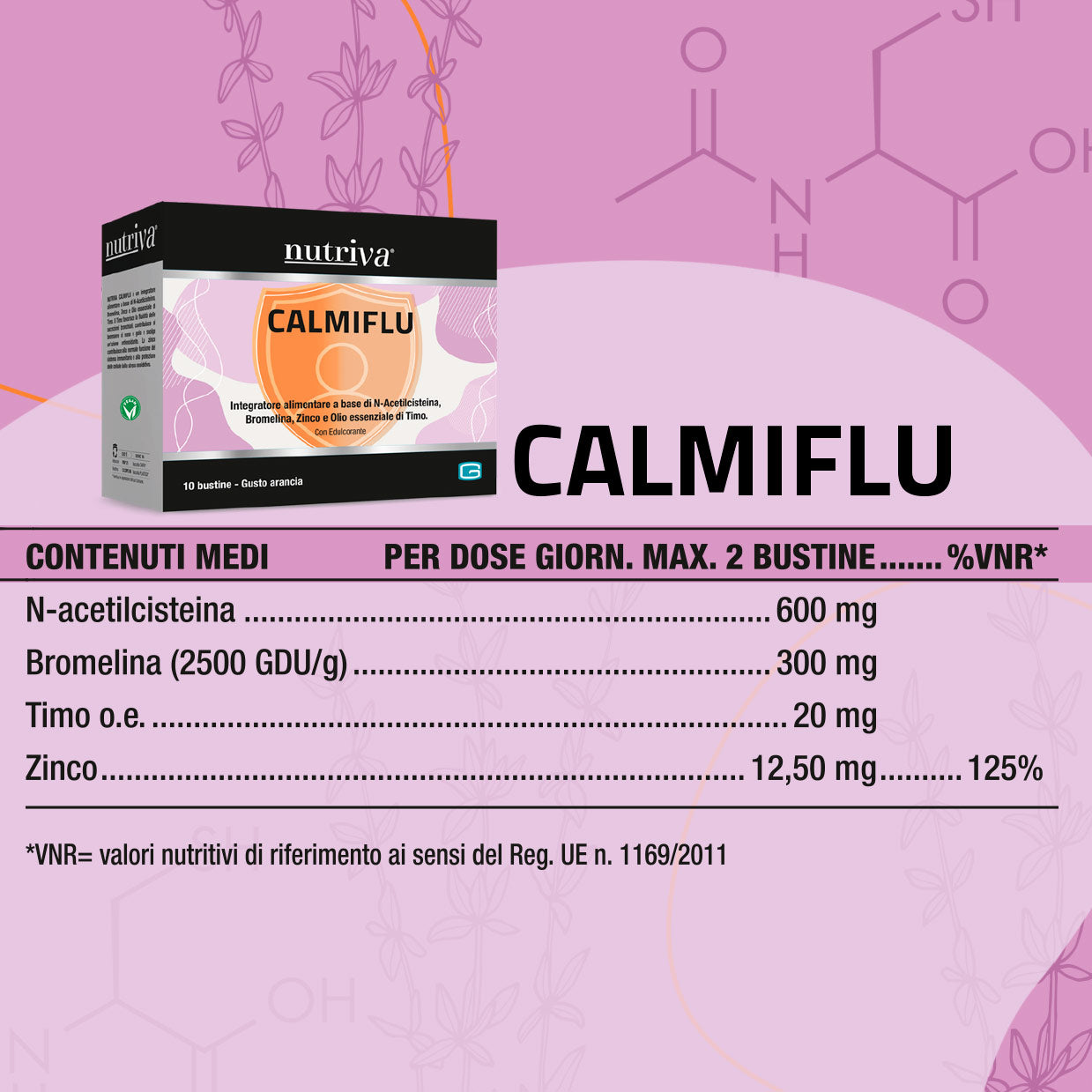 NUTRIVA CALMIFLU è un integratore alimentare a base di N-Acetilcisteina, Bromelina, Zinco e Olio essenziale di Timo. Il Timo favorisce la fluidità delle secrezioni bronchiali, contribuisce al benessere di naso e gola e svolge un’azione antiossidante. Lo Zinco contribuisce alla normale funzione del sistema immunitario e alla protezione delle cellule dallo stress ossidativo.
