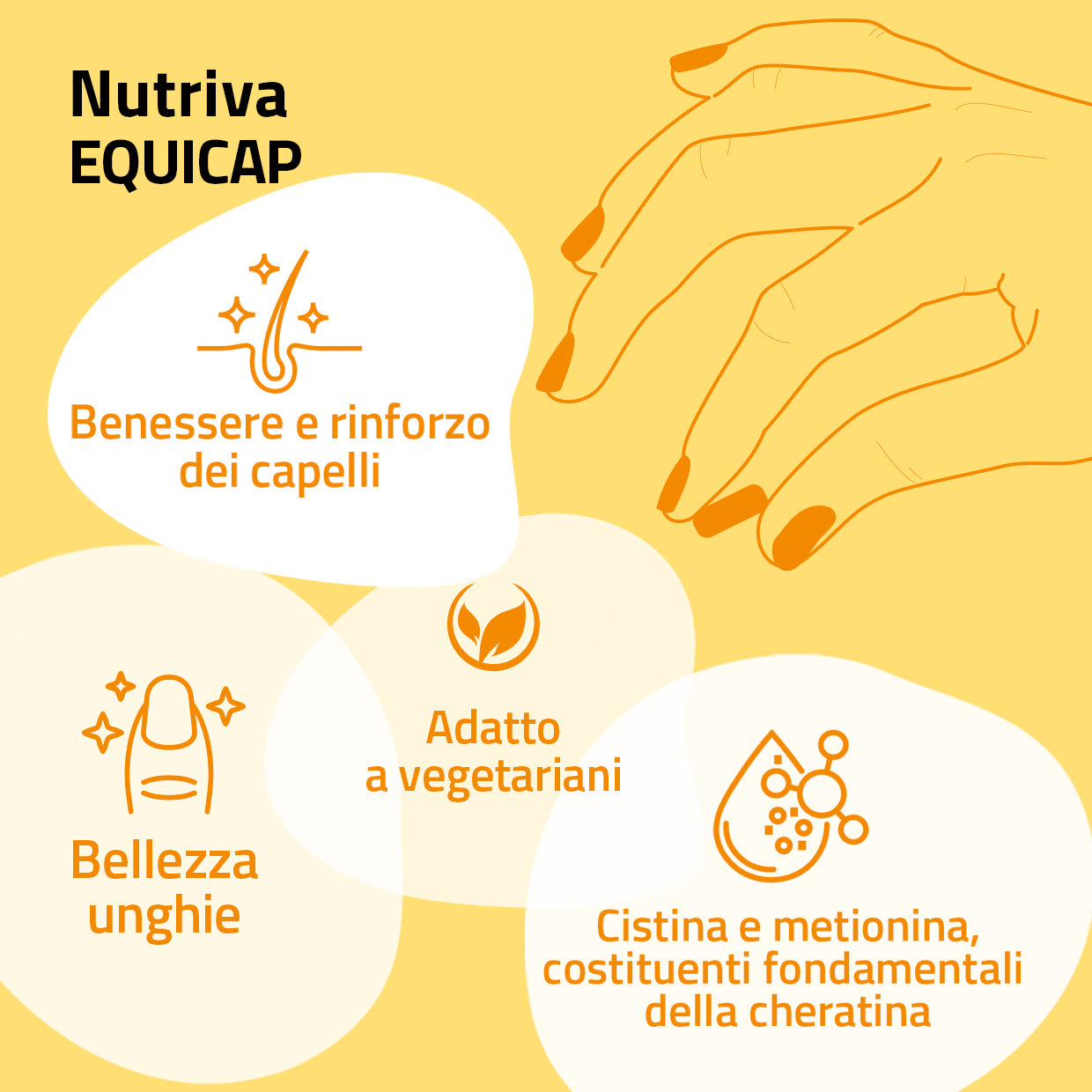 Nutriva EQUICAP è un integratore completo di vitamine e minerali che fornisce un supporto trofico alla struttura degli annessi cutanei. Il bamboo è una pianta molto ricca in silice organica, contenendo oltre il 77% di silicio molto biodisponibile. Quest’oligoelemento è un componente fondamentale dei tessuti connettivi contribuendo a rinforzare e aumentare l’elasticità del capello. Le vitamine del gruppo B, inoltre, sono indispensabili per la sintesi della cistina e per la crescita dell’unghia.
