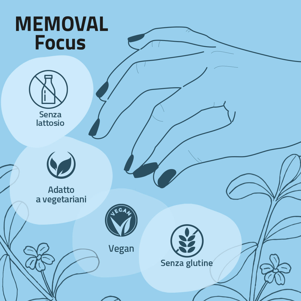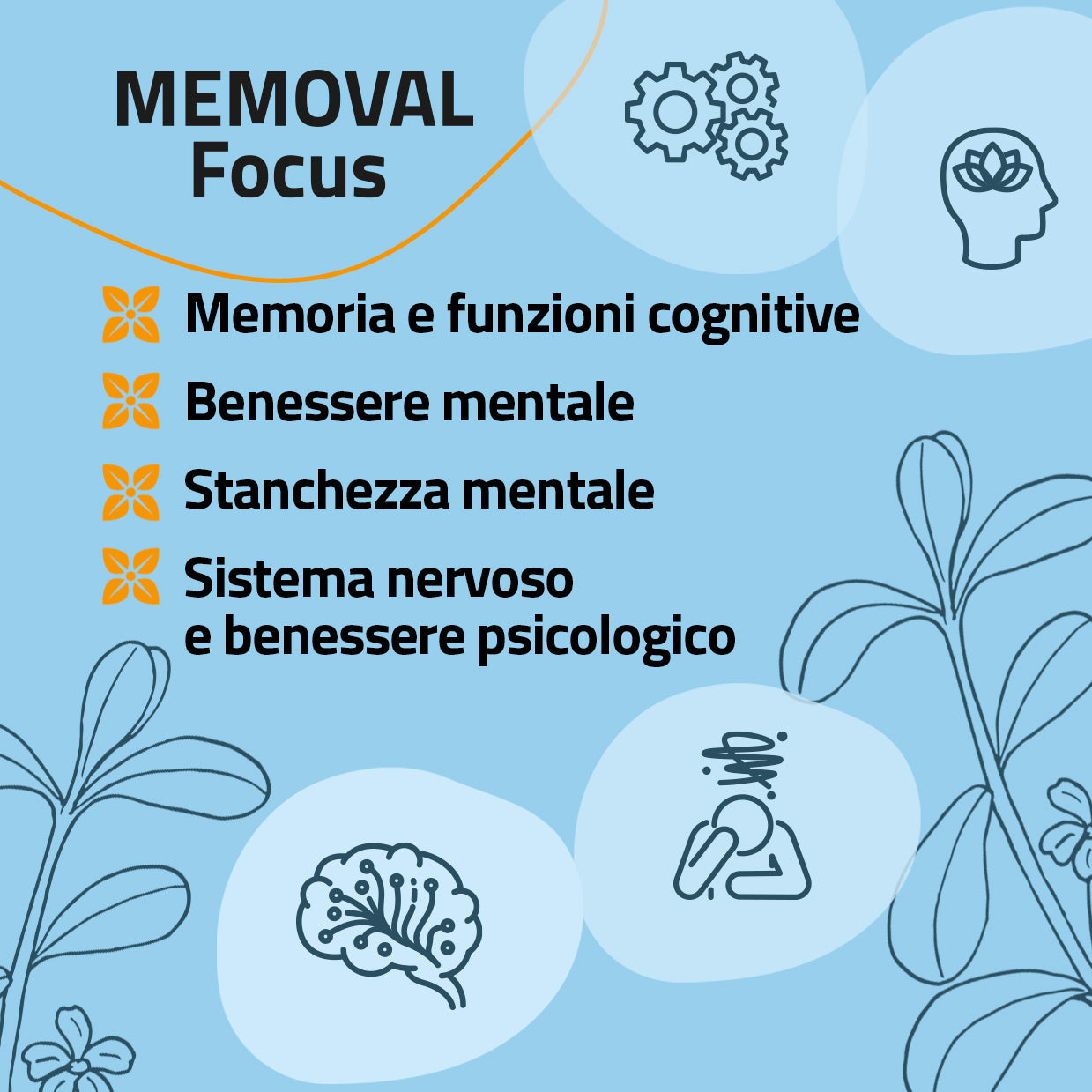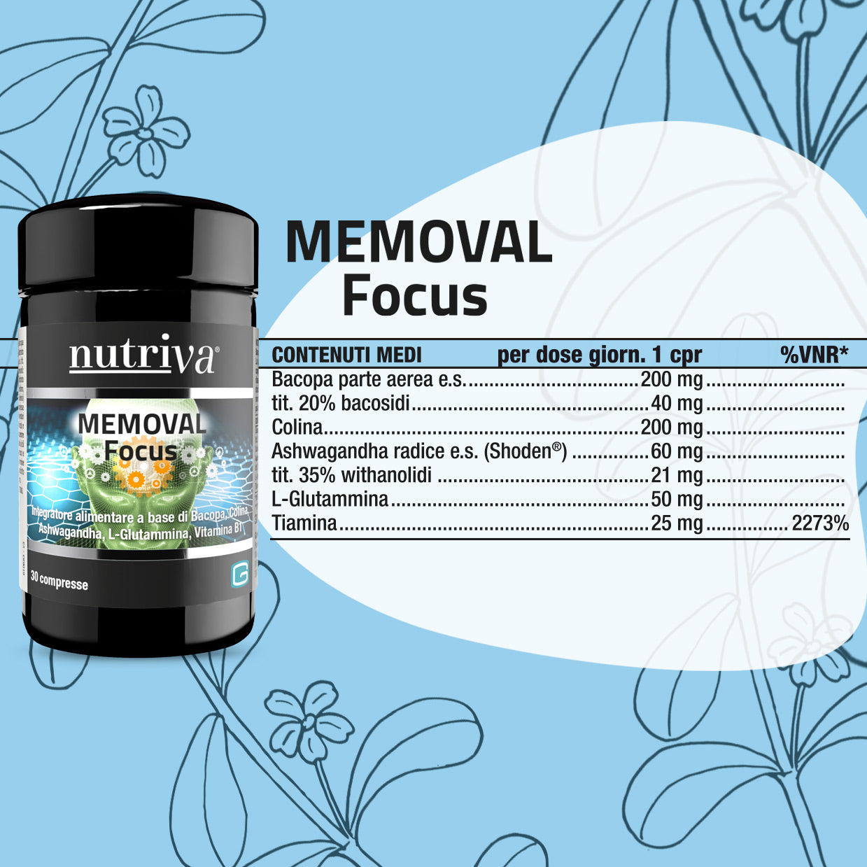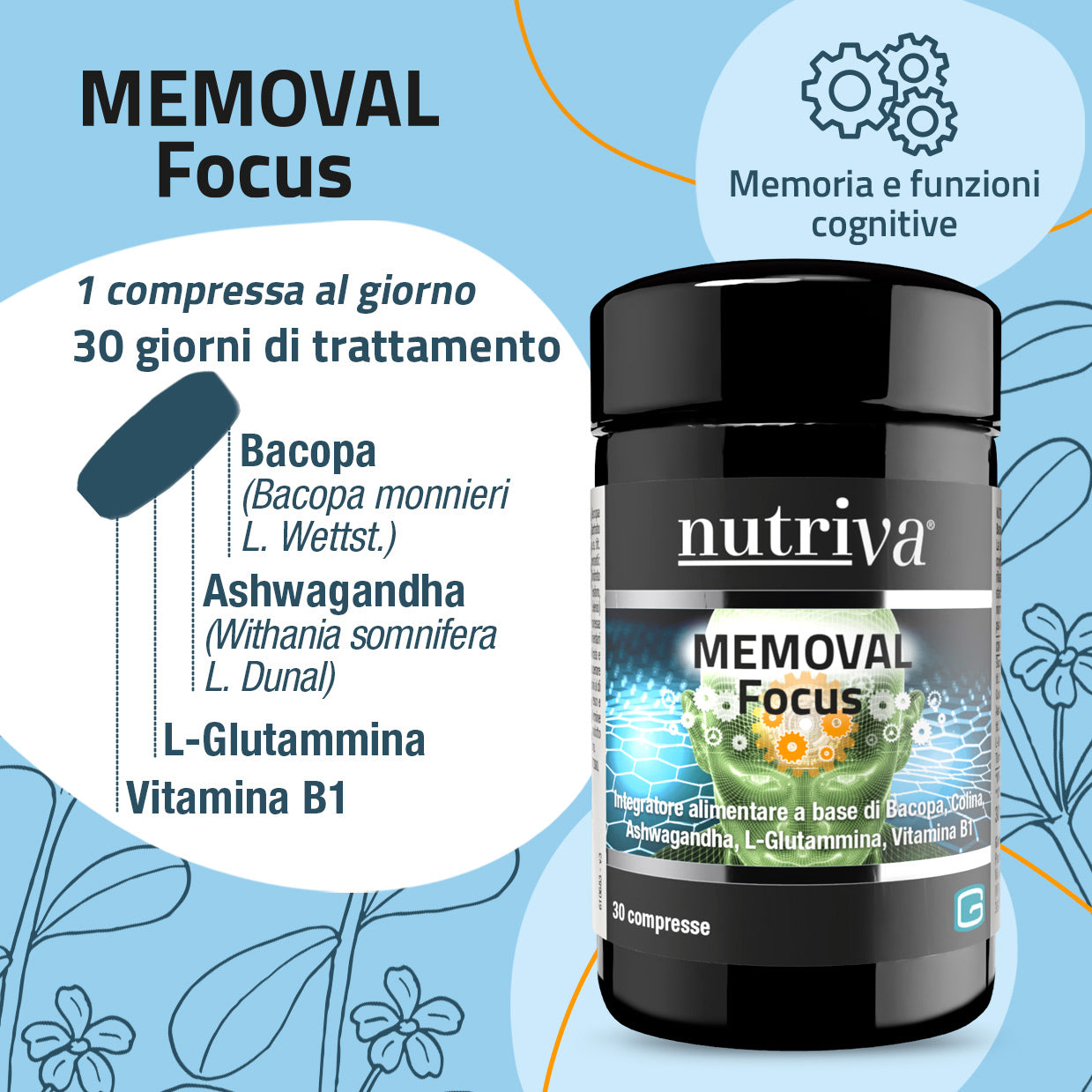 Nutriva Memoval Focus è un integratore alimentare sinergico di principi attivi utili per il supporto al benessere e stanchezza mentale, alla memoria e funzioni cognitive, e come utile coadiuvante al benessere psicologico e del sistema nervoso.