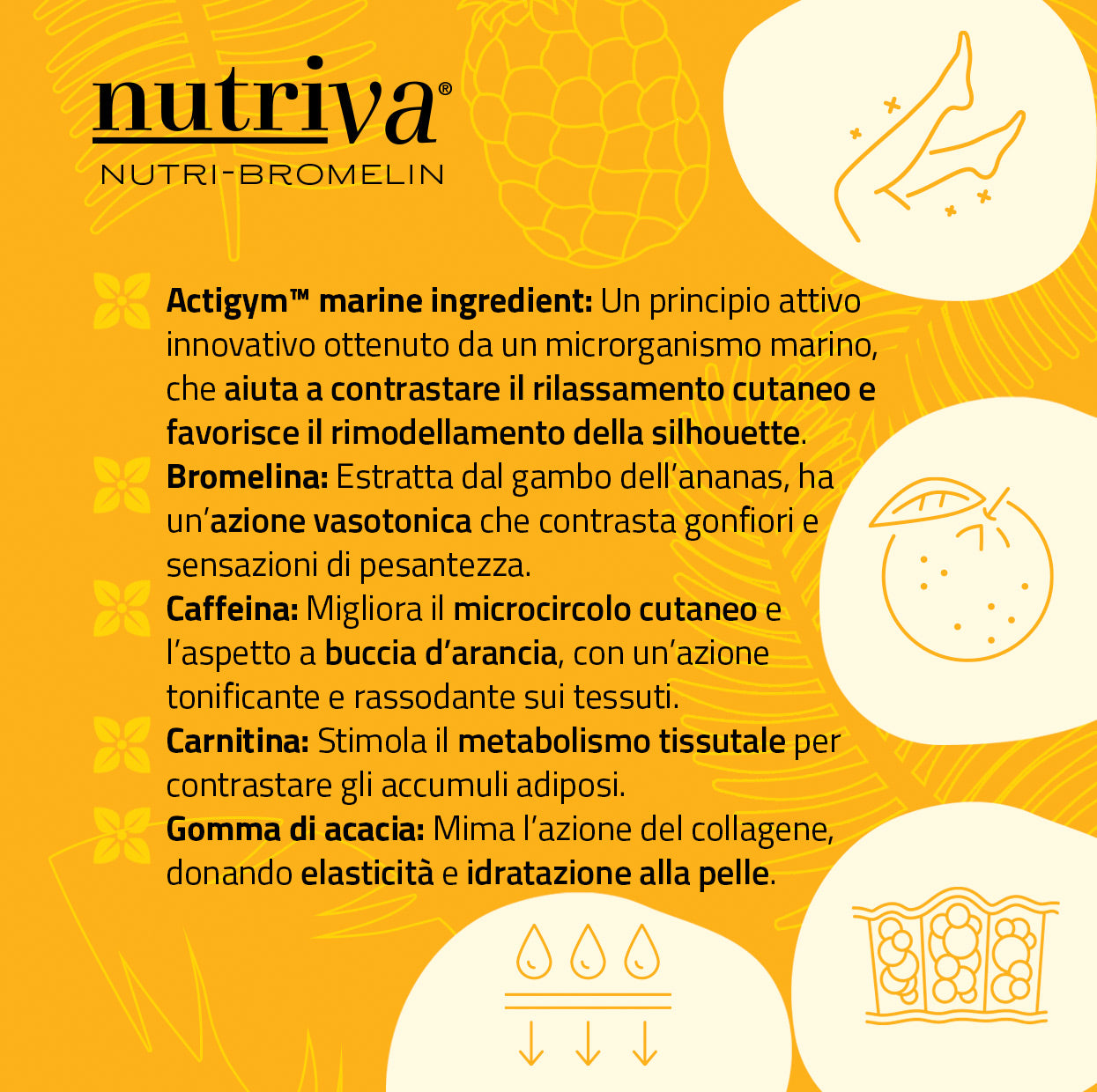 Nutri-Bromelin Gel Corpo Cellulite è un prodotto a base di Actigym™ marine ingredient e Bromelina ideale per la pelle colpita da ritenzione idrica ed inestetismi della cellulite. Gli attivi contenuti nella formula agiscono sulle zone specifiche soggette agli inestetismi della cellulite come fianchi, addome e gambe. Il gel è arricchito con Actigym™ marine ingredient, un innovativo principio attivo ottenuto tramite biotecnologie da un microorganismo proveniente dall’Isola di Bermuda. L’azione di Actigym™ marine ingredient contrasta il rilassamento cutaneo, favorisce il rimodellamento della silhouette e la riduzione della circonferenza delle cosce.