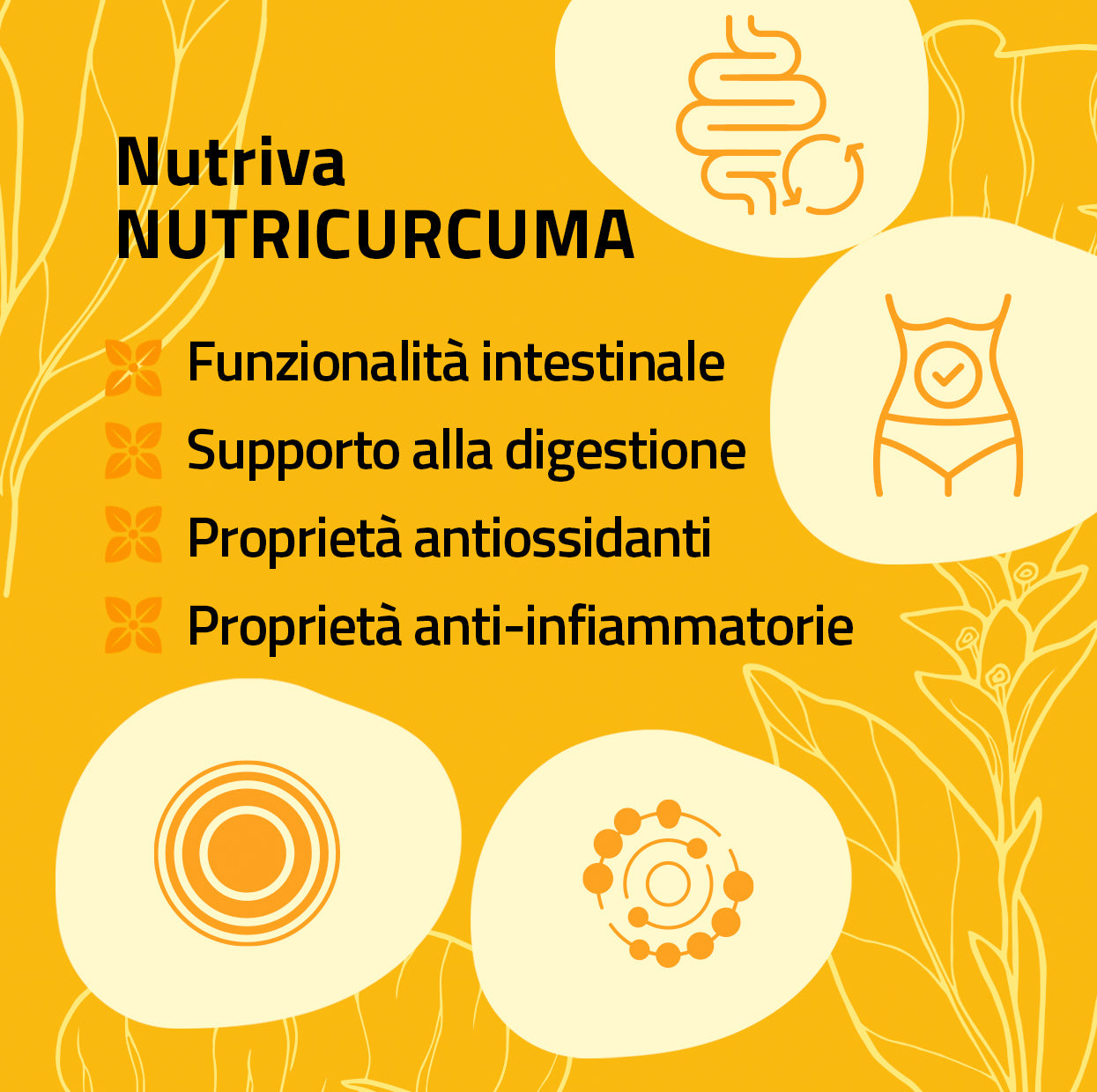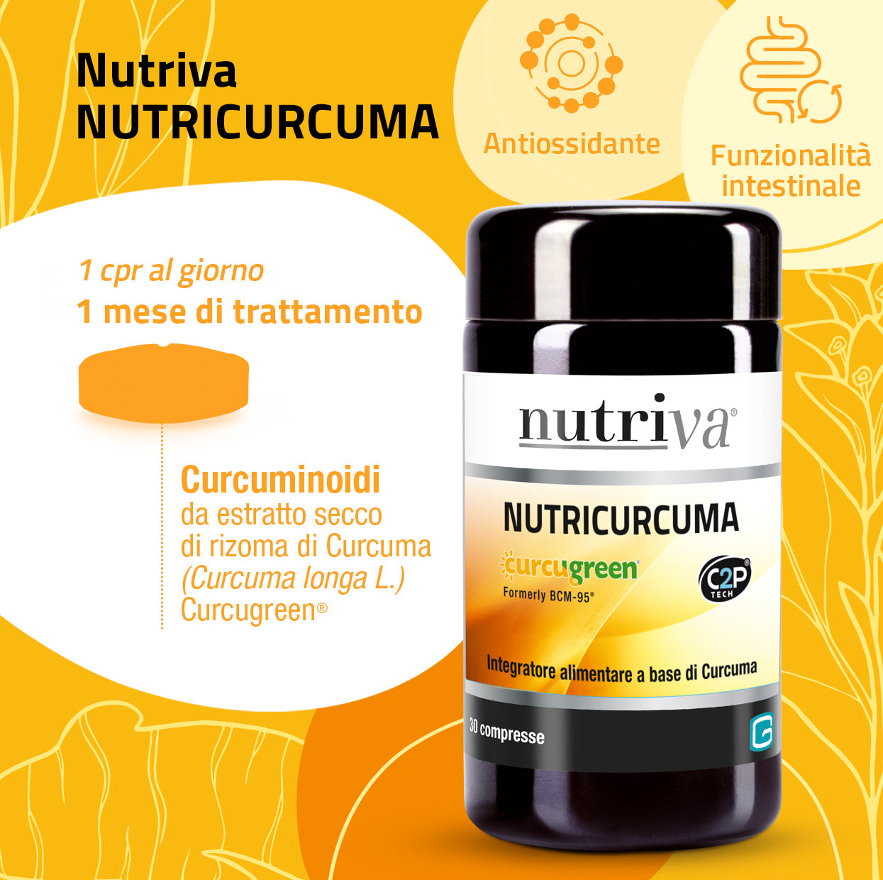 Nutriva Nutricurcuma è un integratore alimentare di alta qualità che sfrutta le proprietà benefiche della curcuma, un pigmento vegetale giallo-arancio che può avere una funzione antiossidante e può essere di supporto per la normale funzionalità articolare.