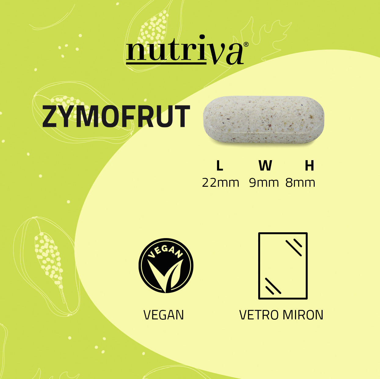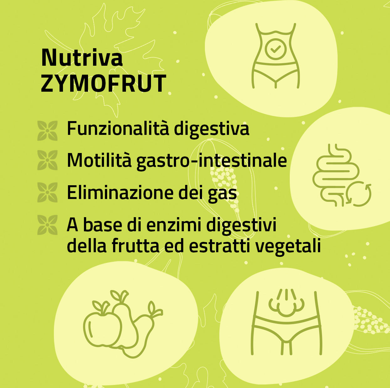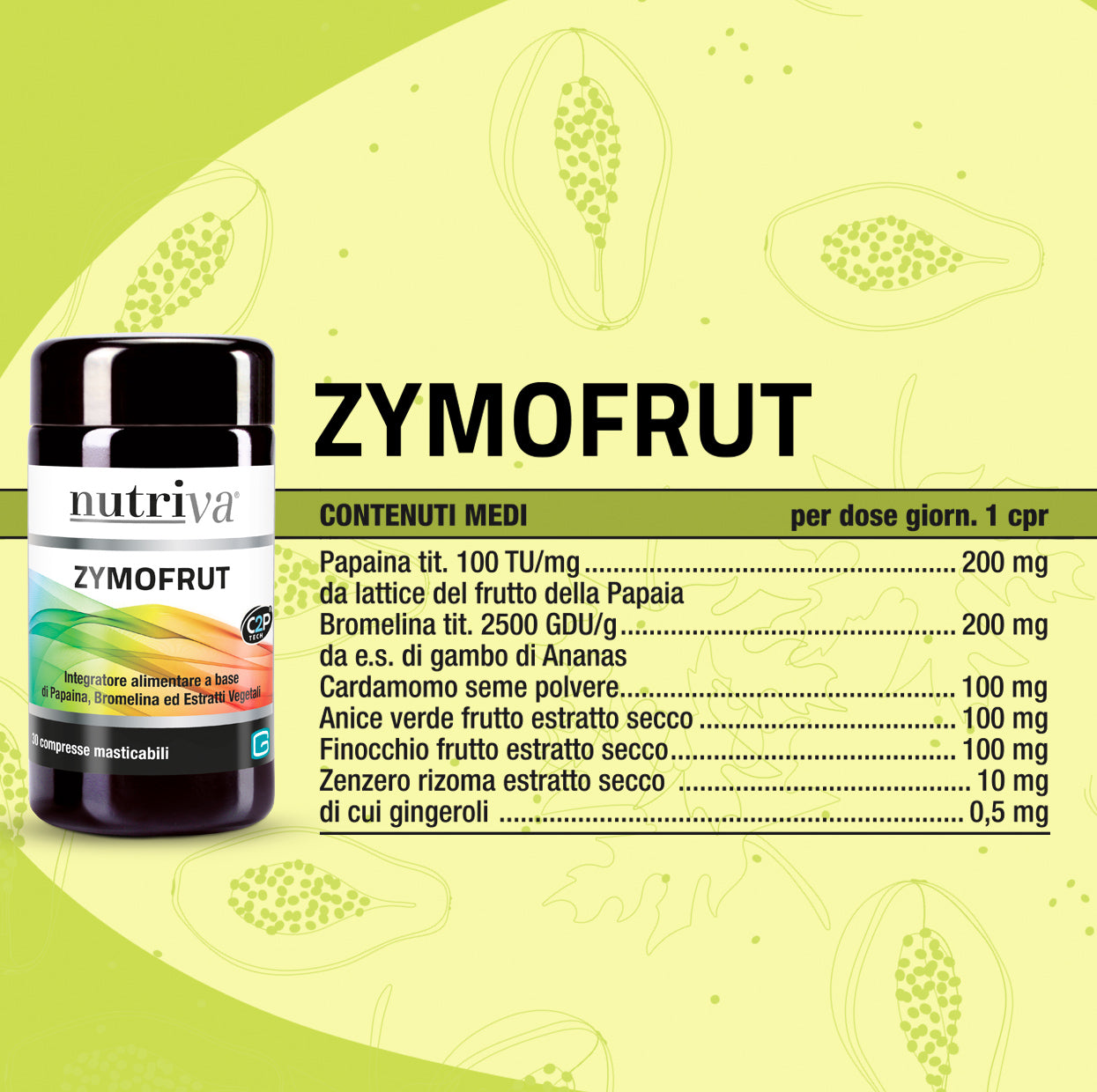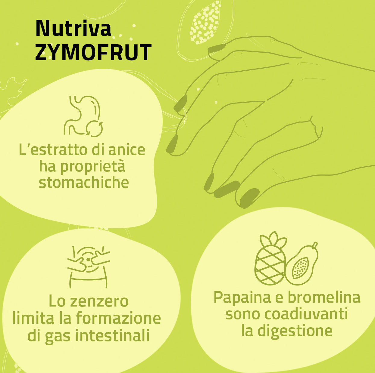 Nutriva Zymofrut è un integratore alimentare a base Papina, Bromelina, enzimi digestivi della frutta, ed estratti vegetali. Contiene Zenzero, Cardamomo e Anice che regolano la motilità gastrointestinale e l’eliminazione dei gas.