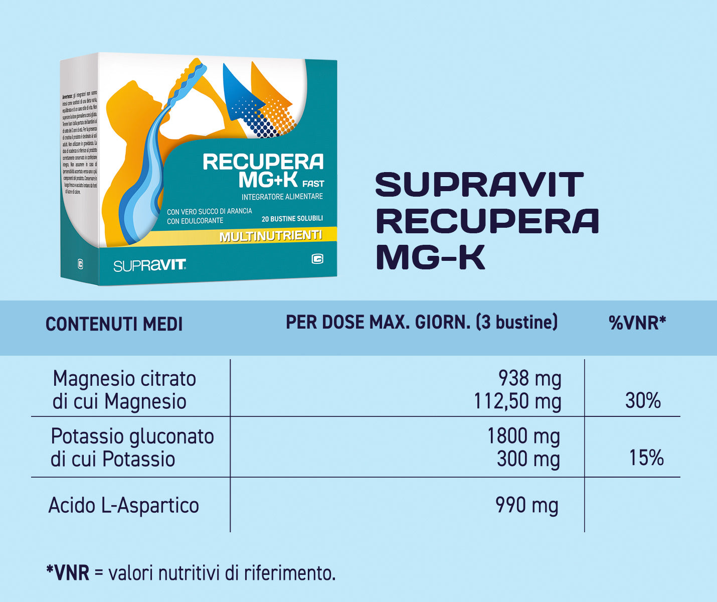 Supravit Recupera MG-K è un integratore alimentare in 20 bustine contenente Magnesio, Potassio e Acido L-Aspartico con varie funzioni per l'organismo.